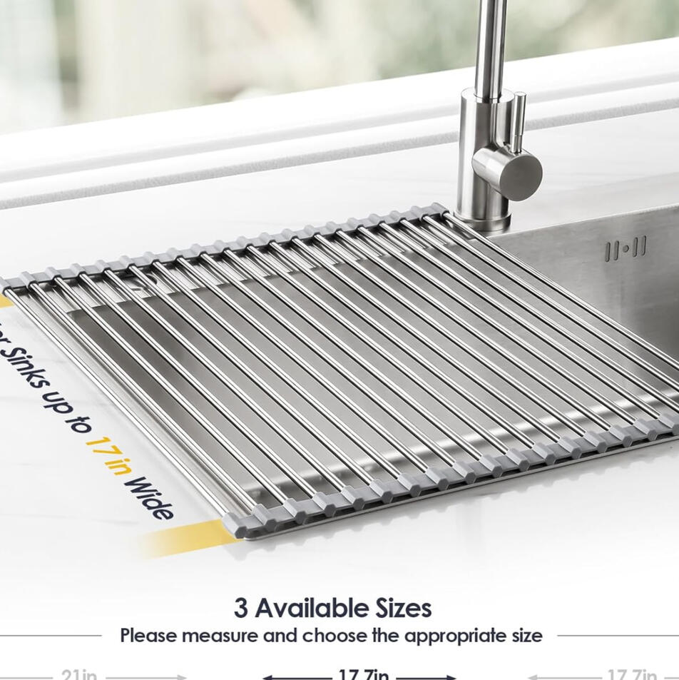Dry your dishes then roll it away. Fits over the sink, saves space, and looks way better than a plastic rack.